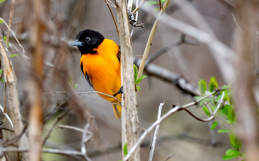 The Baltimore Oriole is a brightly colored songbird known for its brilliant orange and black plumage and its beautiful flute-like song. These birds often visit backyards in spring and summer, especially where fruit, nectar, or jelly feeders are available.